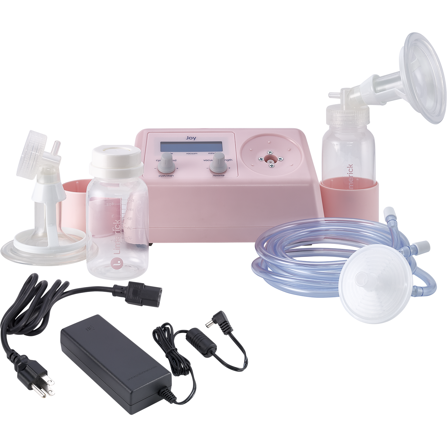 Joy–digital breast pump, ComforTouch™ kit, and power supply.